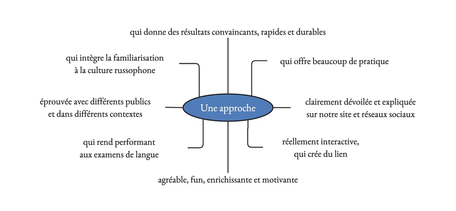 De manière générale, il s'agit d'une approche ciblée et interactive pour travailler le rapport à la langue, permettant de débloquer et de découvrir de nouveaux sons et rythmes propres à la langue russe, qui ne sont pas toujours intuitifs pour tous les apprenants.